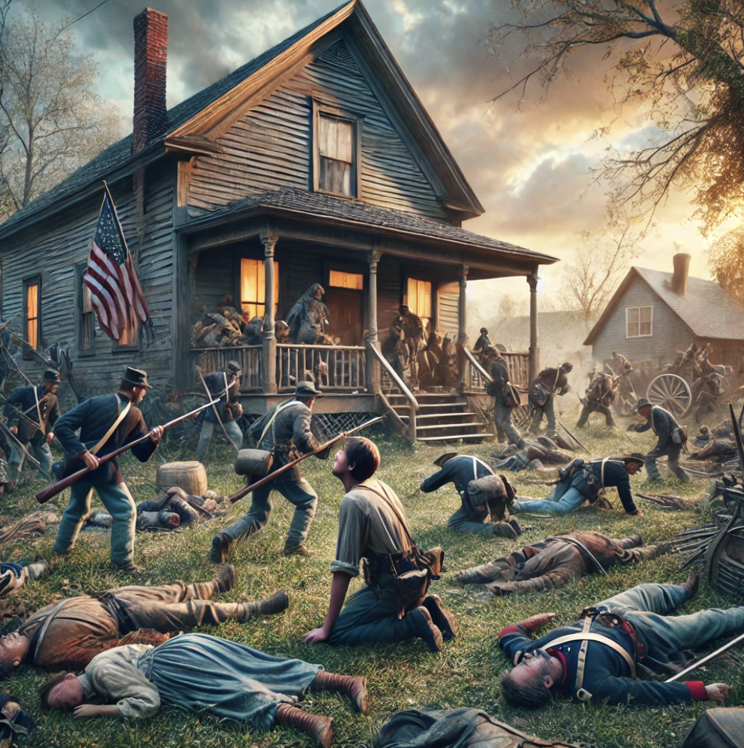 That night, I had another dream. I was just me this time, I was walking through the battlefield, I was invisible. I could even walk through people. About the spot where my house today is, was a three-story clapboard house. I looked around, there were many tents as far as the eye could see, near me was a young boy, he could not have been more than 16 or 17. His arm was in a sling, he was laying on a blanket, and he was crying. I walked closer to him, and he looked up at me.